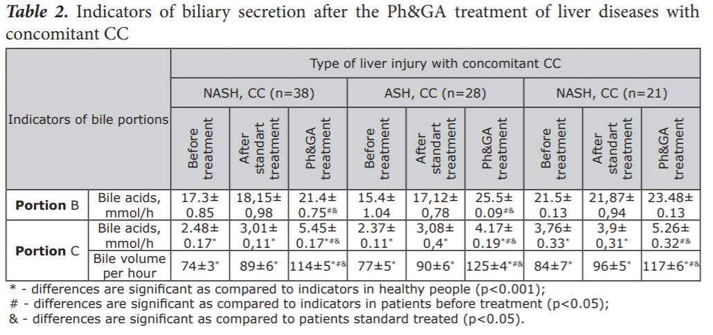 By way of fractional multi-moment duodenal intubation, we saw a significant increase in the density of gallbladder bile, a decrease in pH of portions of gallbladder and liver bile in the conditions of liver diseases with concomitant CC. The Ph&GA treatment was more effective for improvement ><0.05) patients with fatty stools (grey or light colour) compared to % in the standard treated group and 87% at baseline. On endoscopic investigation, significant decrease of occurrence of hyperaemia, the presence of granulation tissue, edema and bleeding were determined after treatment with equal effectiveness in both treated groups. In the Ph&GA treated group there were more pronounced improvement of main histological features. Thickening of subepithelial collagen table of more than 10 µm, as well as inflammatory cellular infiltration with the presence of plasmocytes in the infiltrate and the presence of areas of cellular neutrophilic infiltrations around the capillaries were not diagnosed after the Ph&GA treatment. By way of fractional multi-moment duodenal intubation, we saw a significant increase in the density of gallbladder bile, a decrease in pH of portions of gallbladder and liver bile in the conditions of liver diseases with concomitant CC. The Ph&GA treatment was more effective for improvement of these parameters than standard treatment. As Table 2 shows, in the liver bile (portion C), in patients with liver injury and concomitant CC, a significant decrease in the level of bile acids is noted, as well as a significant decrease in secreted bile volume, as compared to the groups without CC. Under the Ph&GA treatment, we observed a significant increase in choleresis and the flow rate of bile acids (Table 2). On comparison of the two schemes of treatment, the more pronounced influence of phosphatidylcholine and glycyrrhizic acid on biliary secretion was observed.