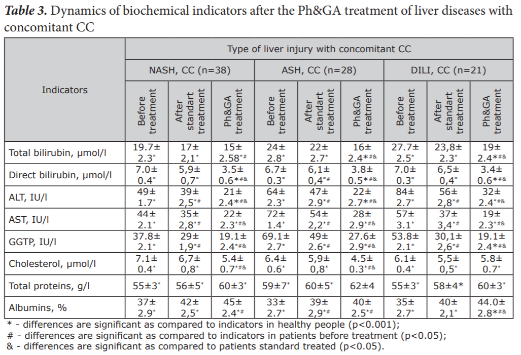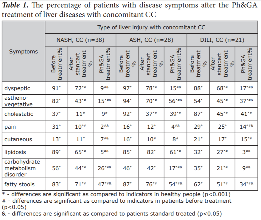 Our findings indicate that after treatment of liver injury and concomitant CC in two experimental groups (standard treatment and with addition of phosphatidylcholine and glycyrrhizic acid), patients were diagnosed with significantly decreased manifestation of the syndromes that are presented in Table 1. Under the Ph&GA treatment the percentage of patients with diagnosed symptoms was extremely less (Table 1).
