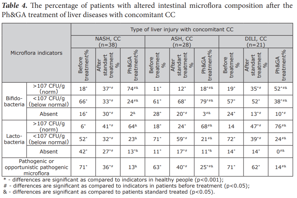 After combination therapy with the use of phosphatidylcholine and glycyrrhizic acid, We noted in the stool culture of 51% of patients, the growth of bifidobacteria, as well as the growth of lactobacteria in 68% of all patients; also a significant decrease in the number of Staphylococci, yeasts, Bacteroides, Protei, Cytobacter, Klebsiellae in 36% of all patients (Table 4). These results indicated greater potency of the Ph&GA treatment for restoration of microflora in patients, compared to standard scheme.