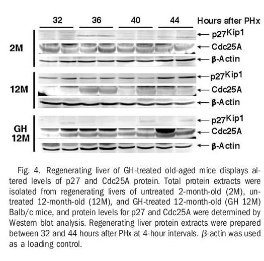Regenerating Livers From GH-Treated Old-Aged Mice Displayed Diminished Levels of Cdk Inhibitor p27 and Increased Expression of Cdc25A Protein. Activation of S-phase promoting cyclin E-Cdk2 and cyclin A-Cdk2 complexes is mediated by Cdc25A dephosphorylation of specific Cdk2 protein residues and is inhibited by Cdk inhibitors, including p27.1-3,5,9,10 Our previous liver regeneration studies with old-aged Balb/c mice showed that increased regenerating hepatocyte expression of FoxM1B alone caused reduced levels of the Cdk inhibitor p27 protein.34 We next examined whether human GH treatment of old-aged mice could influence expression of both Cdc25A and p27 protein levels in regenerating liver extracts using Western blot analysis with commercially available p27 or Cdc25A antibodies (Fig. 4).