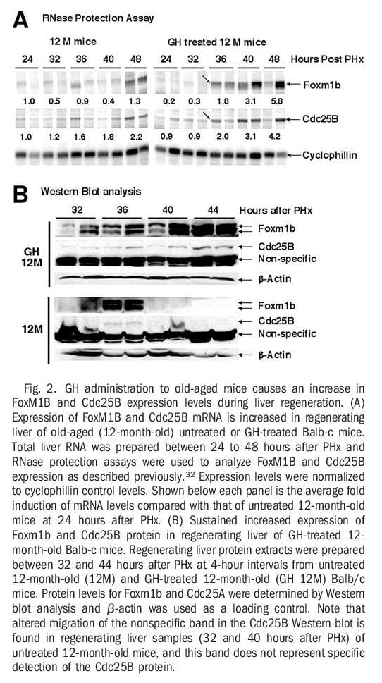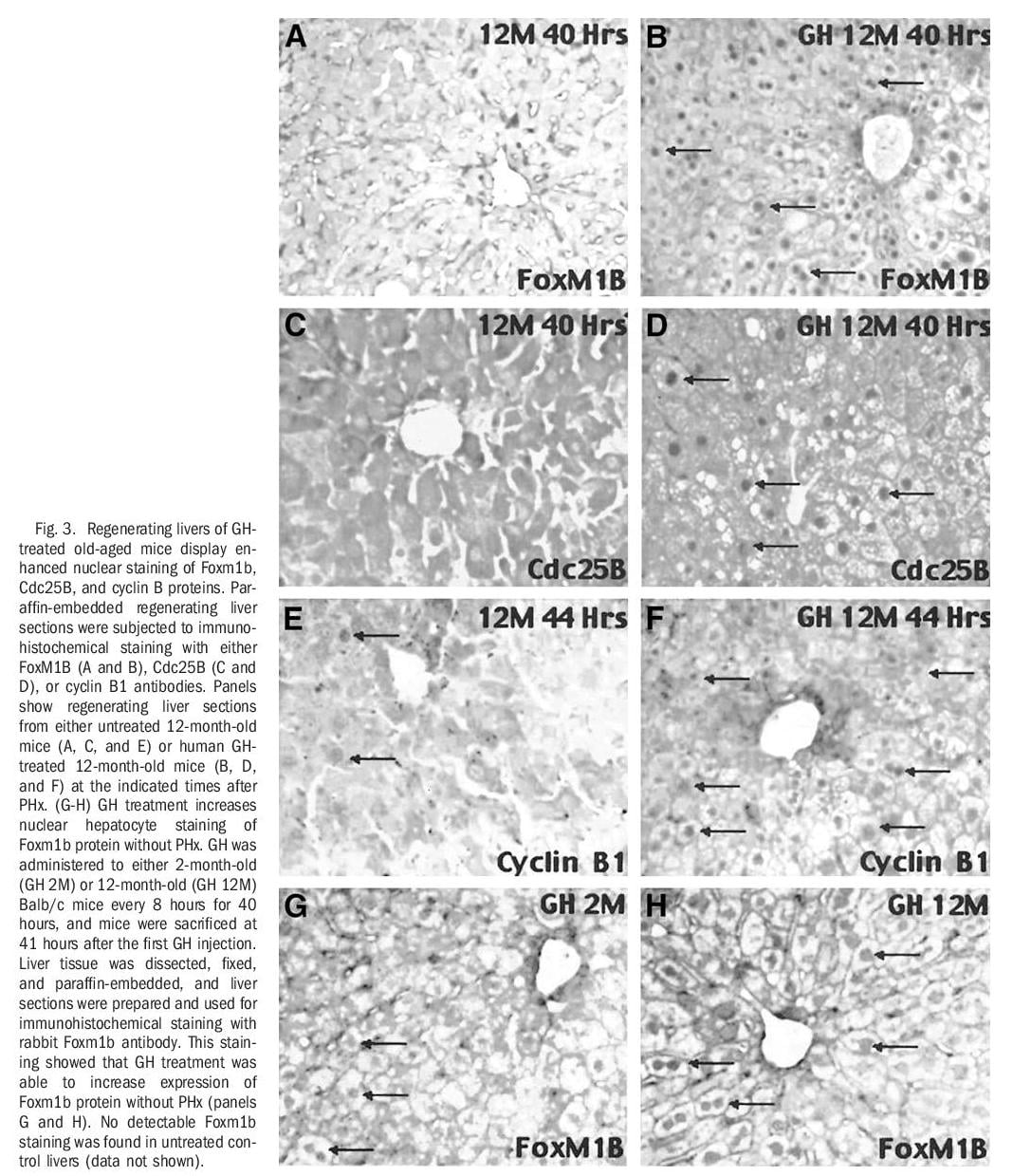Our studies showed for the first time that increased levels of the Foxm1b transcription factor is essential for GH stimulation of regenerating hepatocyte proliferation in old-aged mice (Figs. 5 and 6).