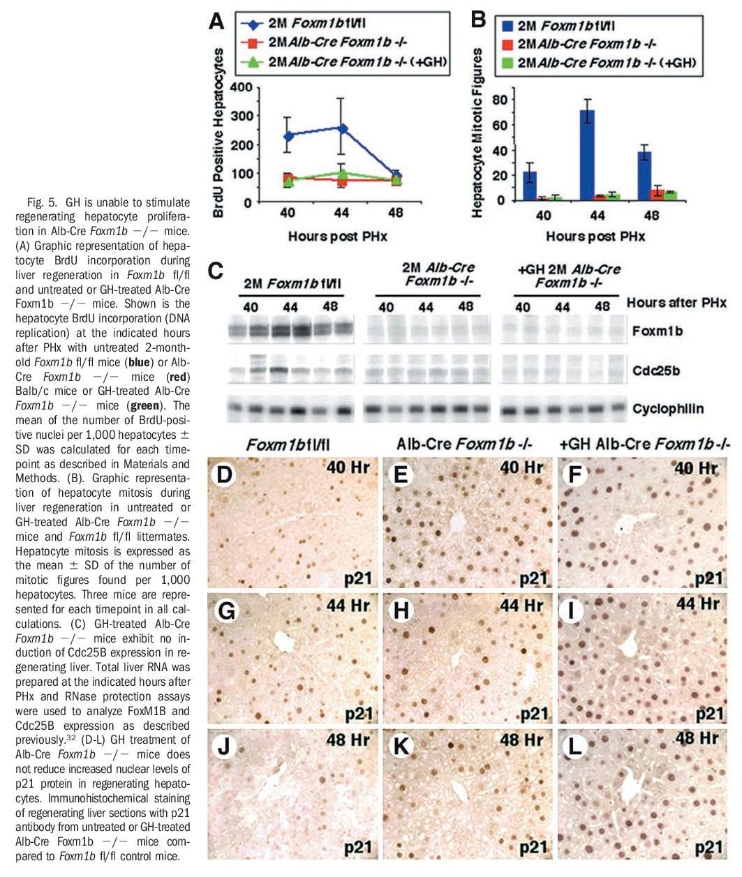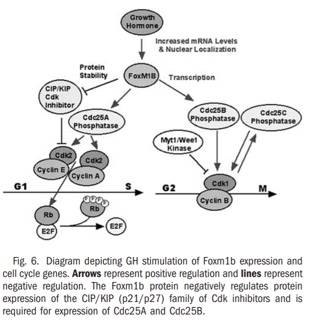 In summary, we showed that administration of human GH to old-aged mice restored regenerating hepatocyte proliferation and Foxm1b expression to levels found in young regenerating liver. This stimulation of regenerating hepatocyte proliferation was associated with increased expression of Cdc25A, Cdc25B, and cyclin B1 proteins with significant reduction in protein levels of the Cdk inhibitor p27, all of which are essential for appropriate cell cycle progression. Finally, these liver regeneration studies with hepatocyte-specific deletion of Foxm1b fl/fl targeted allele provided strong genetic evidence demonstrating that Foxm1b is essential for GH to stimulate regenerating hepatocyte proliferation.