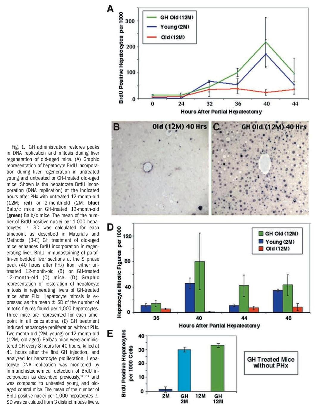 hours after PHx (Fig. 1A, blue line) and they exhibited mitosis between 40 to 48 hours after PHx (Fig. 1D, blue bar). As reported previously,34 untreated old-aged regenerating livers displayed a significant reduction in hepatocyte DNA synthesis (Fig 1A, red line) and mitosis (Fig 1D, red bar) compared with young regenerating liver. In contrast, human GH treatment of old-aged mice increased hepatocyte BrdU incorporation (DNA replication, Fig. 1B-C) and mitosis to levels found in young regenerating liver (Fig. 1A and D, compare green and blue).