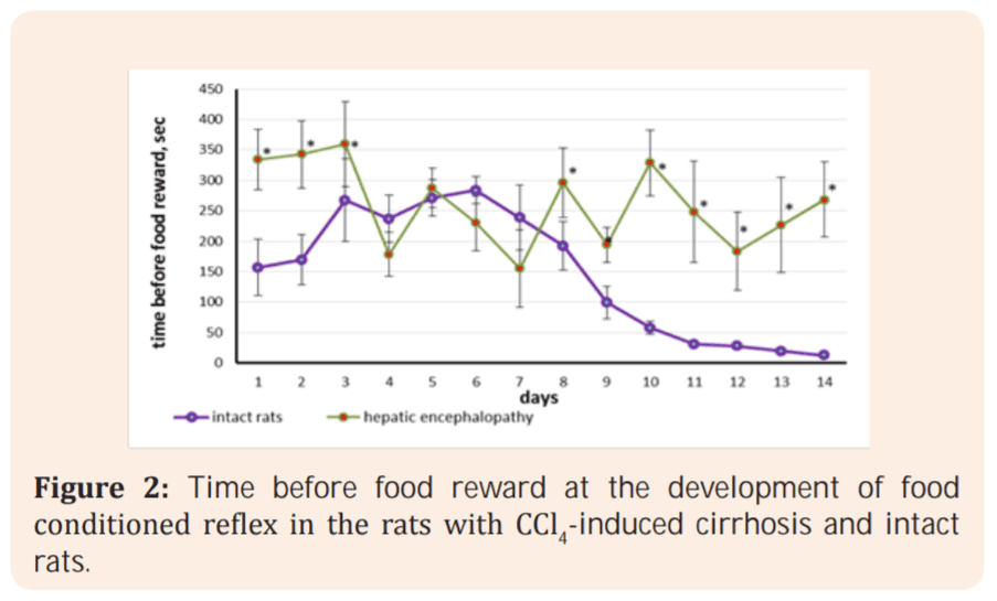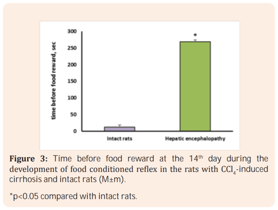 Aims & Methods: That is why the aim of the study was the optimization of the HE modeling and diagnosis. Intra-peritoneal administration of 1ml/kg 15% solution of CCl4 in olive oil four times a week for 4weeks has been suggested for optimal simulation of HE in rats. The development of HE, namely the ability of animals to memorization, learning and thinking was studied by the formation of a food conditioned reflex in the T-shaped maze. 14 rats were divided into two groups: 1st -intact rats and 2nd-rats pretreated with CCl4. The dynamic of reducing the time of getting animals to the food reinforcement in the maze as a result of remembering the location of food was estimated during 14days.