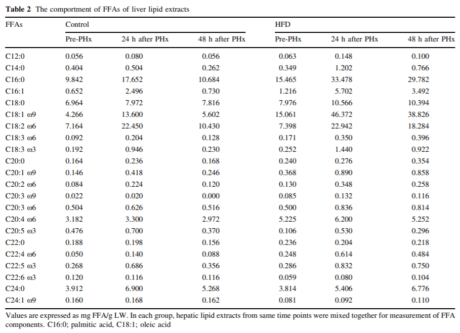 Lipid accumulation and FFA components during liver regeneration after PHx