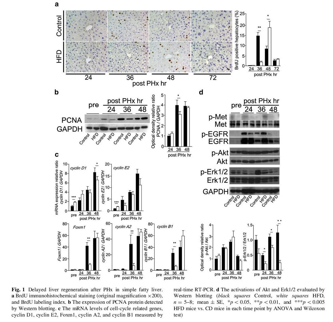 Non-alcoholic fatty liver disease (NAFLD) is a hepatic component of metabolic syndrome and is closely associated with insulin resistance and dyslipidemia [1]. Recently, the prevalence of NAFLD has reached up to 20–30 % of the healthy population [2, 3], and NAFLD is a very common problem in the world. Nowadays, it is estimated that more than 20 % of the patients who plan for liver resection have various degrees of fatty liver [4]. Liver resection is the most curative treatment option for patients with malignant hepatic tumors. Postoperative mortality was decreased by advances in hepatic surgery technique, improvements in patient selection criteria, and accurate perioperative management. However, postoperative complications still remain as important problems in patients with fatty liver [5–7]. It is clinically significant to elucidate the difference between fatty liver regeneration and normal liver regeneration.