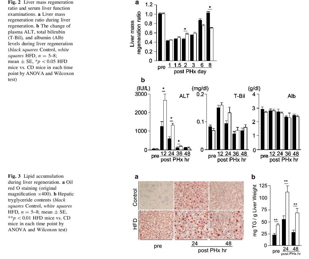 Intrahepatic lipid accumulation occurring from the early regeneration phase in partial hepatectomy (PHx) rodent models seemed to be an essential process [20]. The most important source of lipids that accumulated in the regenerating liver was considered to be mainly free fatty acids (FFAs) supplied from adipose tissue, indeed de novo hepatic fatty acid synthesis also has been reported [21–24]. Lipids were consumed as energy for hepatocyte DNA replication and materials for phospholipids synthesis [25, 26]. However, the influence of excess lipid accumulation during liver regeneration is not clearly understood. Therefore, in this study, we evaluated the relation between liver regeneration and excess lipid accumulation in mice with high fat diet (HFD)-induced simple hepatic steatosis.