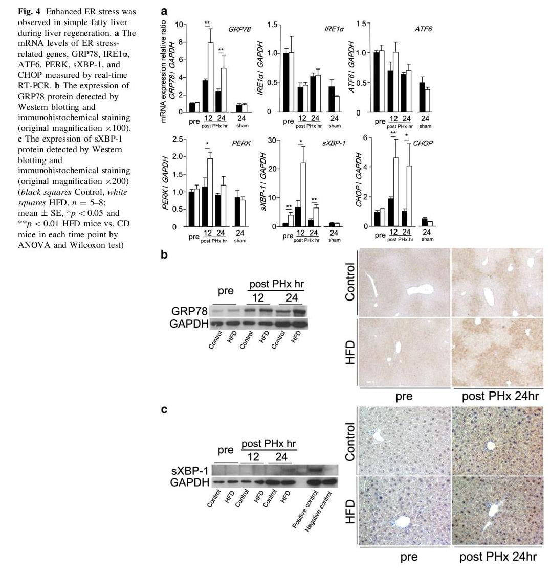 ER is the cellular organelle where proteins and lipids are synthesized and modified. ER stress is caused by various insults, such as oxidative stress, chemical toxicity, viral infection, and metabolic disorders. The UPR, induced by ER stress, is mediated by three primary signal transducer molecules: IRE1a, ATF6, and PERK [31]. It has been reported that NAFLD patients have shown various degrees of UPR [32], and a rat model fed saturated FFAs rich diet also showed hepatic ER stress [33]. To evaluate the influence of lipid overaccumulation for liver regeneration, we at first analyzed the change of intrahepatic FFA components during liver regeneration. Interestingly, intrahepatic FFA components increasing during liver regeneration were similar in both groups, not influenced by their nutritional conditions. Among FFAs, the amount of intrahepatic palmitic acid was dramatically increased during liver regeneration, especially in mice with simple hepatic steatosis. Several studies have reported the changes of FFA components after PHx. These authors described the roles of unsaturated FFAs as signal transducers, but did not mention saturated FFAs [34, 35]. Recently, many studies have reported the cytotoxic effects of saturated FFAs, such as stearic acid and palmitic acid, and the cytoprotective effects of unsaturated FFAs, such as oleic acids and linoleic acid. In in vitro studies, some authors demonstrated that saturated FFAs induced ER stress in a dose-dependent manner and promoted cell death, mainly by apoptosis, and others reported that unsaturated FFAs protected cell from saturated FFAs-induced lipotoxicity by lipid droplets formation [29, 30]. In this study, the mRNA expressions of GRP78, a major ER chaperone, and of UPR pathways were not different in both groups before PHx. During liver regeneration, the expression of GRP78 protein was increased significantly higher in mice with simple hepatic steatosis. The mRNA overexpressions of sXBP-1 and CHOP, downstream molecule of UPR, were detected especially in mice with simple hepatic steatosis. sXBP-1 protein was detected in mice with simple hepatic steatosis only at 24 h after PHx. These results suggested that various levels of ER stress was induced not only in fatty liver but also in normal liver during liver regeneration after PHx, however the trigger level might be higher in fatty liver than in normal liver.