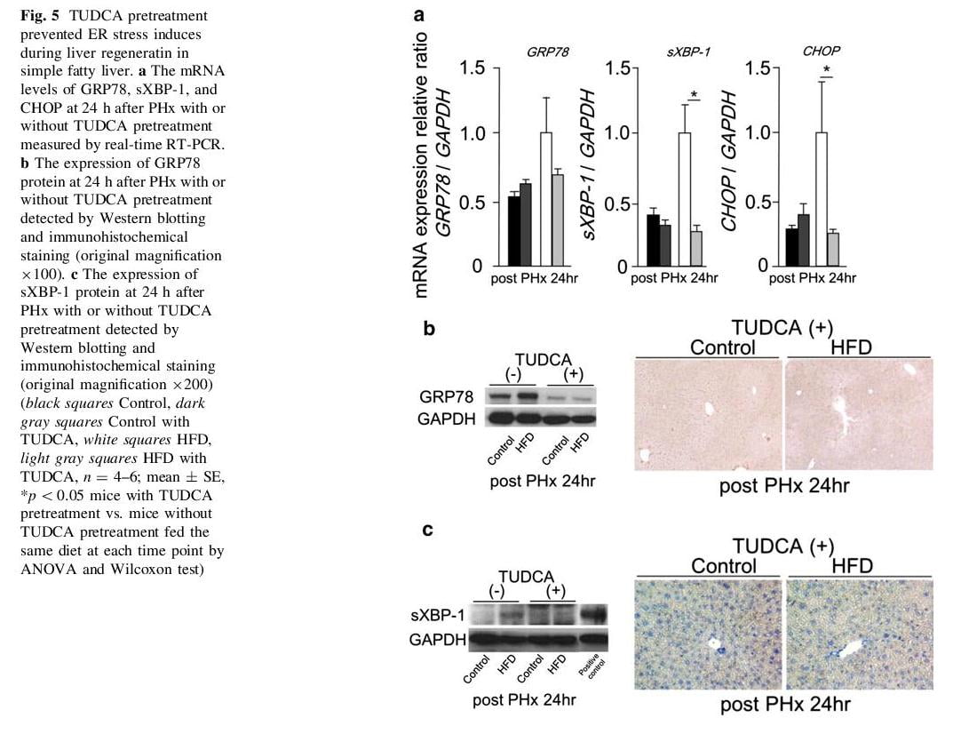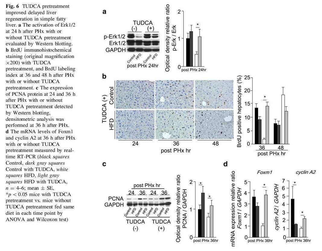 RESULTS: The peak of hepatocyte BrdU incorporation, the expression of proliferation cell nuclear antigen (PCNA) protein, and the expressions of cell cycle-related genes were observed in delayed time in HFD mice. The expression of phosphorylated Erk1/2 was also delayed in HFD mice. The amounts of liver triglyceride were at least twofold higher in HFD mice at each time point. Intrahepatic palmitic acid was increased especially in HFD mice. ER stress induced during liver regeneration was significantly higher in HFD mice. In HFD mice, pretreatment with TUDCA reduced ER stress and resulted in improvement of delayed liver regeneration.