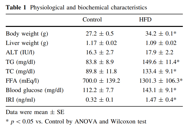 The concentrations of plasma alanine aminotransferase (ALT), triglycerides (TG), total cholesterol (TC), and glucose were measured using the transaminase CII-test Wako kit, TG E-test Wako kit, TC E-test Wako kit, and glucose CII-test Wako kit (Wako Pure Chemical Industries, Tokyo, Japan). The concentration of plasma FFAs was measured using the NESCAUTO NEFA Kit-U (Alfresaphama, Osaka, Japan), insulin was measured using the insulin ELISA kit (Morinaga Institute of Biological Science, Yokohama, Japan), total bilirubin was measured by the bilirubin oxidase method, and albumin was measured by BCG method (Oriental Yeast).