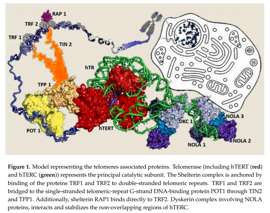 In humans, telomeres consist of thousands copies of six base repeats (TTAGGG) located at the extremities of the chromosomes that protect chromosomes tips from end-to-end fusion, rearrangement and translocation. Telomere length is progressively shortened at each mitosis, due to the inability of the DNA polymerase complex to replicate the very 5’ end of the lagging strand (attrition). For this reason, telomere shortening may function as a “mitotic clock” to sense somatic cells aging. When telomeres become critically short, a DNA-damage program is activated, leading to apoptosis or cell senescence. On the contrary, immortal cells (cancer, stem and germ cells) constitutionally express telomerase, a ribonuclear enzymatic complex associated with telomeres that is responsible for stabilizing telomere length by synthesizing new DNA sequences and adding them to the end of the chromosomes during DNA replication [1]. Telomerase comprises two essential components: Telomerase reverse transcriptase (hTERT) and its RNA template, the telomerase RNA component (hTERC). Dyskerin complex binds to hTERC, in order to protect it and to stabilize the telomerase complex. It includes four nucleolar proteins: Dyskerin (DKC1) and Nucleolar protein family A member 1, 2 and 3 (NOLA1-NOLA2-NOLA3) [2–4]. Besides telomerase, the Shelterin complex, which binds specifically to telomeres, plays a fundamental role in the protection of chromosome ends facilitating telomerase-based telomere elongation [5]. It is composed of six core proteins: the telomeric repeat binding factors 1 and 2 (TRF1-TRF2) that bind telomeric double strand DNA, the protection of telomeres 1 (POT1), which binds the 31 telomeric region of single strand DNA avoiding the degradation by nuclease, and the TRF-1 interacting protein 2 (TIN2), the POT1-TIN2 organizing protein (TPP1) and the repressor/activator protein 1 (RAP1), that interact with the other proteins bound to telomere stabilizing the complex (Figure 1; [6,7]). of proteins involved in maintenance and repair of telomeres are responsible for telomeropathies [8,9]: a spectrum of progressive genetic diseases exemplified in the most severe cases by dyskeratosis congenita (DKC), whose common autosomal recessive form is caused by mutations in DKC1. They are degenerative and age-dependent diseases, characterized by premature senescence of the stem cell compartment, determining increased risk of organ failure and cancer, with possible involvement of the hematopoietic compartment, lungs, mucous membranes, skin, and also the liver. Consistently, loss-of-function mutations in hTERT and hTERC may cause a spectrum of familial liver diseases [10]. Telomere length is a strong hereditable tract and telomere shortening is accentuated in chronic degenerative condition associated with high cell replication rate. Thus, involvement of telomeres and telomerase mutations seems to be important in predisposition to liver disease progression towards hepatocellular carcinoma (HCC). Indeed, the incidence of HCC increases with age, and, in particular, in nonalcoholic fatty liver disease (NAFLD), where there is a strong aggregation of familial cases [11].