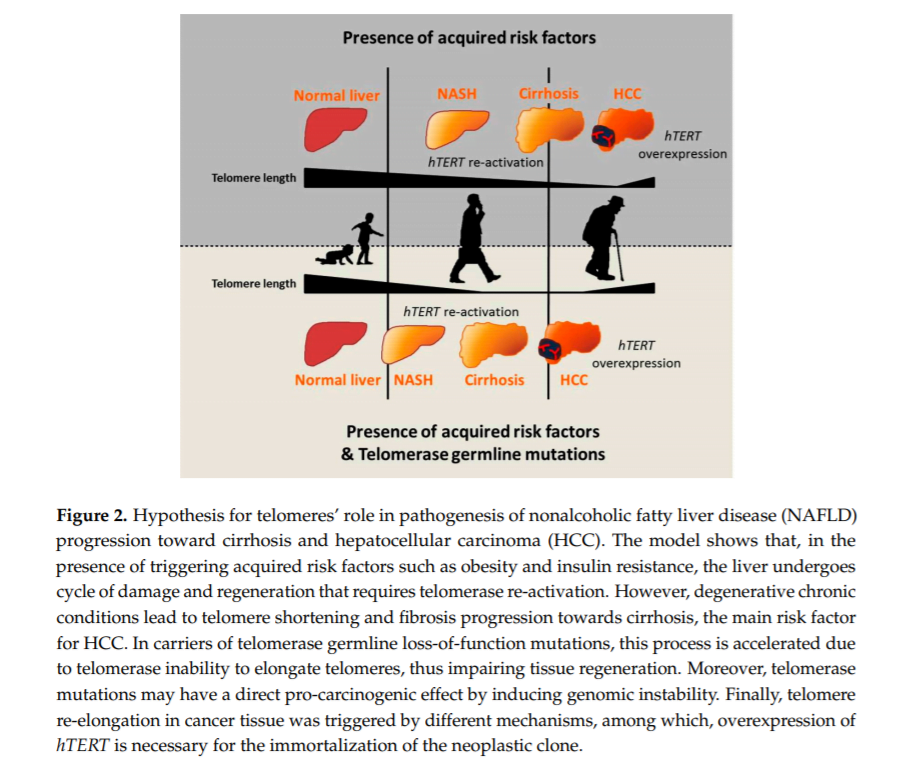 Genetic studies have proven that mutations in telomerase represent the underlying cause of accelerated telomere shortening and organ failure in some rare human diseases, including some forms of DKC [29], which may be characterized by liver injury and development of complications of portal hypertension. Moreover, evidence suggests that telomere attrition is also involved in liver disease progression in humans. Indeed, a spectrum of familial liver disease with autosomal dominant transmission and incomplete penetrance has been associated with inheritance of hTERT and hTERC mutations [10,30]. In these pedigrees, liver disease was characterized by development of steatosis, with possible progression to cirrhosis and HCC. Furthermore, a significant enrichment of missense mutations in the hTERT and hTERC genes was observed in 7% of patients and one patient, respectively, of a US cohort including 134 patients with cirrhosis of different etiologies (NAFLD, but also alcohol abuse and Hepatitis C virus infection), as compared to healthy controls. These mutations impaired hTERT enzymatic activity, as they were associated with reduced telomere length in the peripheral blood of patients and reduced telomerase activity in vitro [19]. These data were substantially confirmed in a larger series of 521 German patients with cirrhosis, of whom 3% carried functional hTERT mutations again independently from the etiology of the liver disease [31]. These observations indicate that, in at least a proportion of patients who developed cirrhosis, fibrosis progression may be favored by genetic risk variants facilitating telomere shortening and cell senescence in the presence of triggering factors.